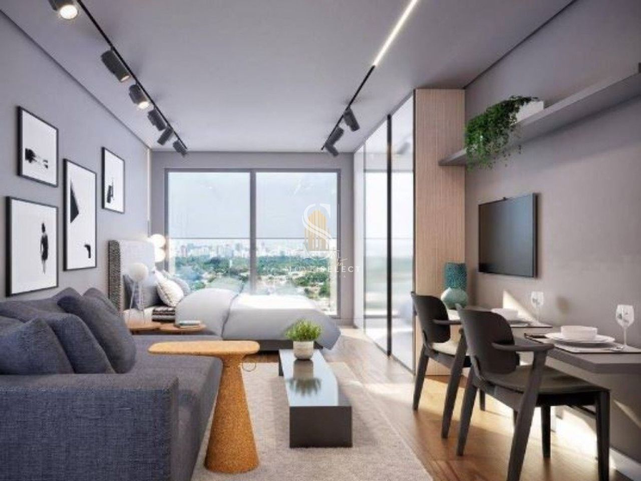 Studio de 50m² com 1 dormitório, cozinha, sala, banheiro, varanda, sem vaga.