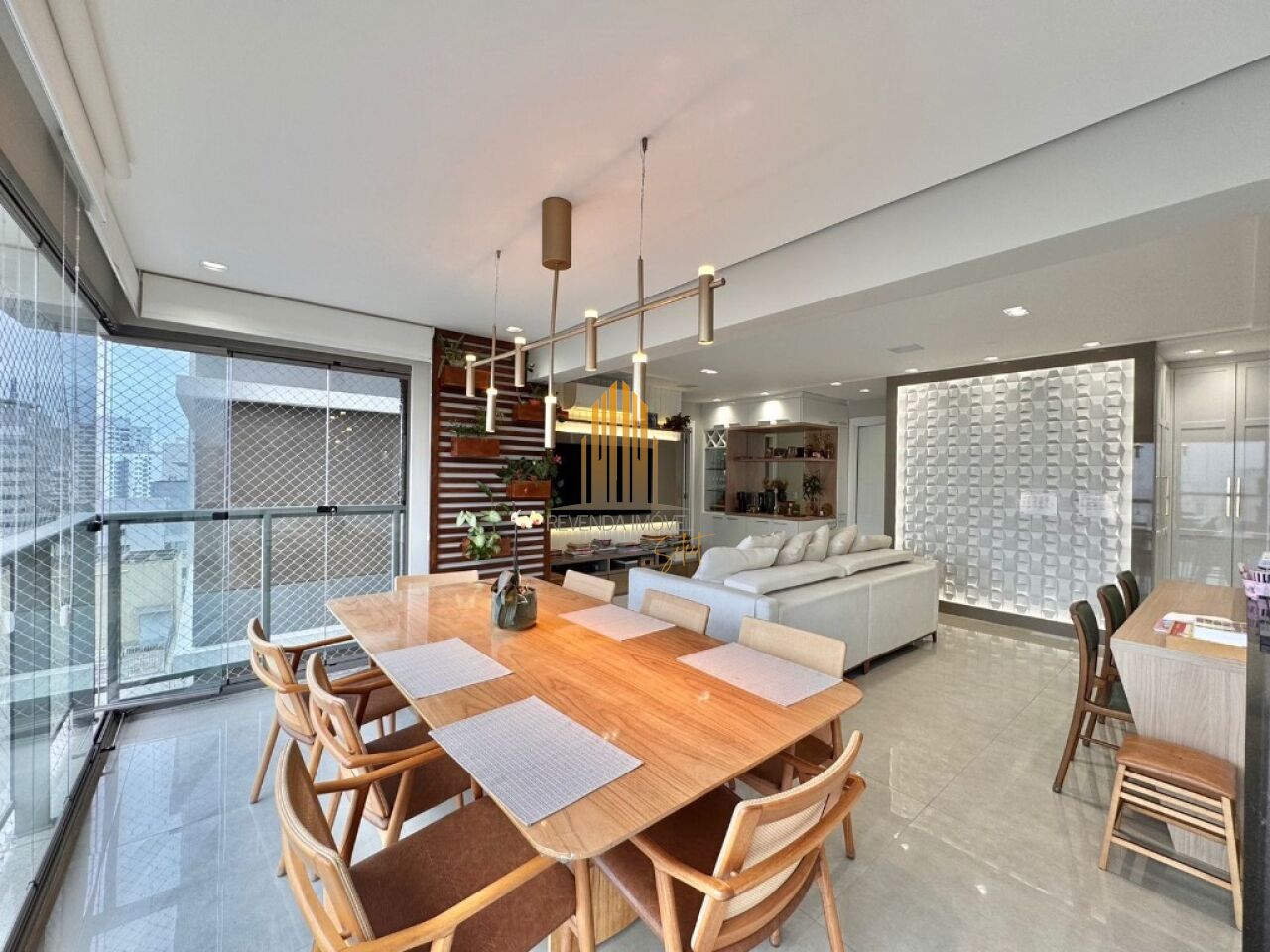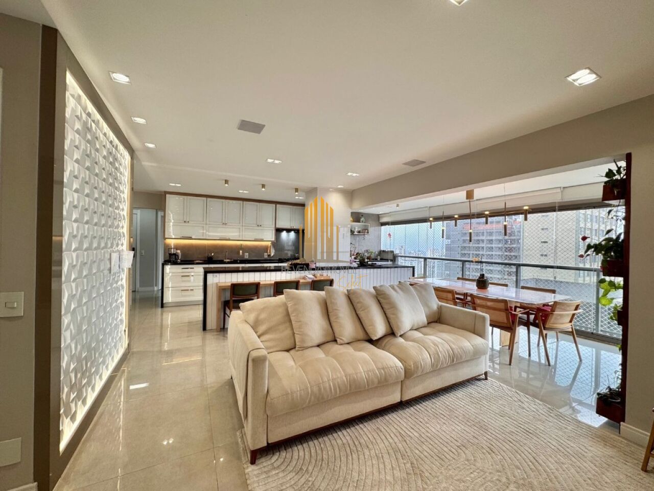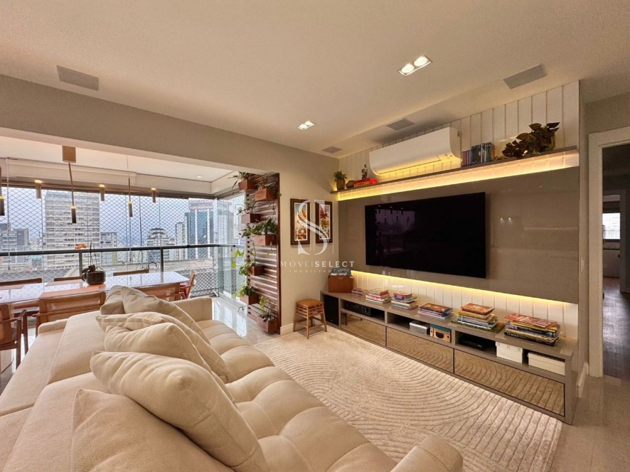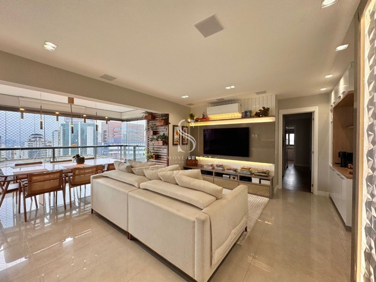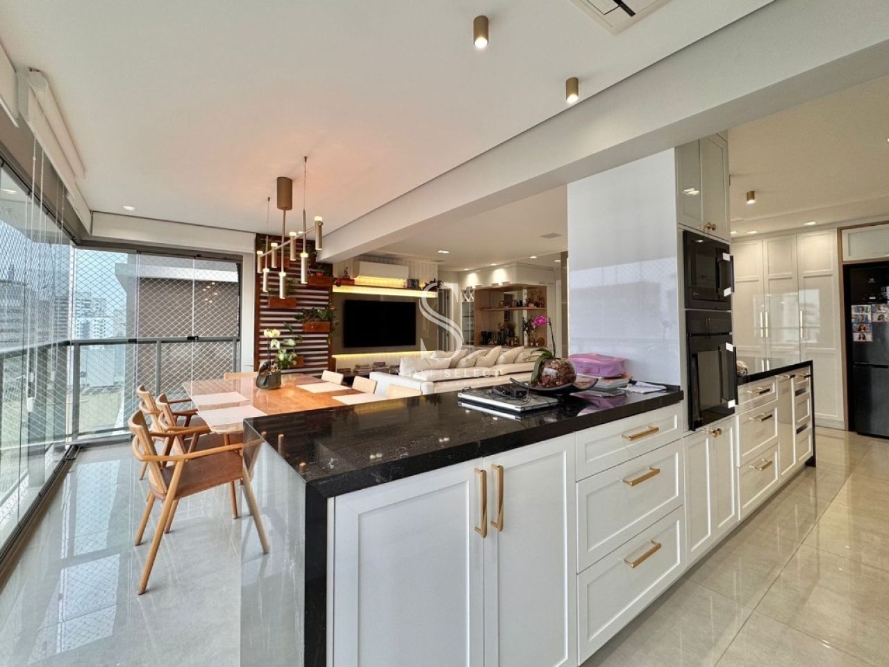 Apartamento em andar alto, com living amplo, sala de jantar, lavabo e terraço, cozinha planejada com armários Kitchens. Na parte íntima, sala de TV, acesso direto da cozinha (passagem íntima), 04 dormitórios, sendo 02 suítes, todos com armários Ornare, suíte máster com closet. Apto com hall privativo. 04 amplas vagas de garagem. Lazer completo no condomínio.
