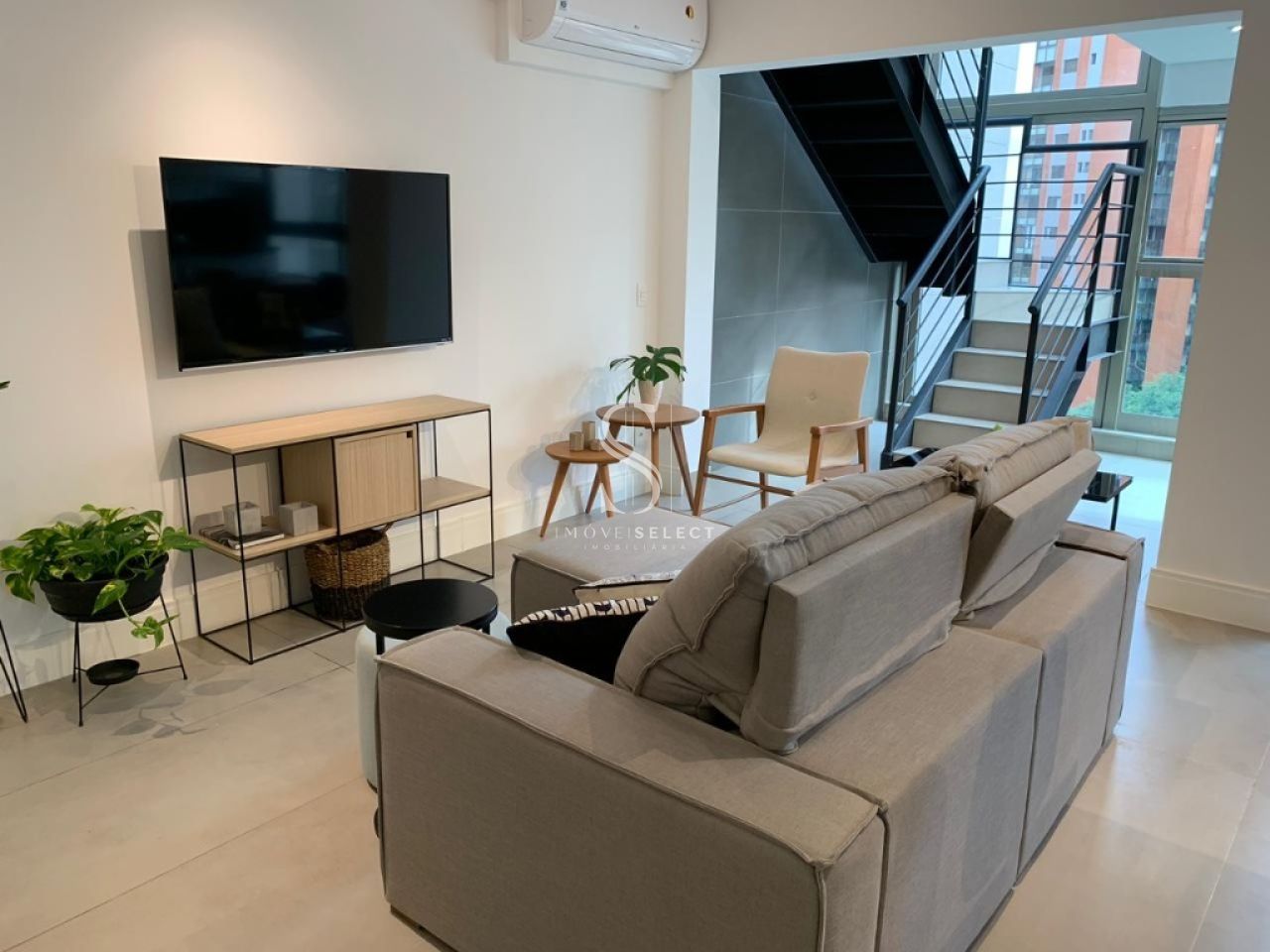 No pavimento inferior, possui amplo living e lavabo com chuveiro e máquina lava e seca, home theatre e cozinha americana com ilha, integrada a sala de jantar, 2 vagas.