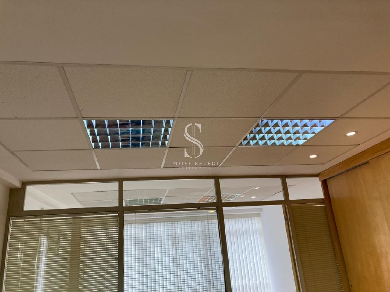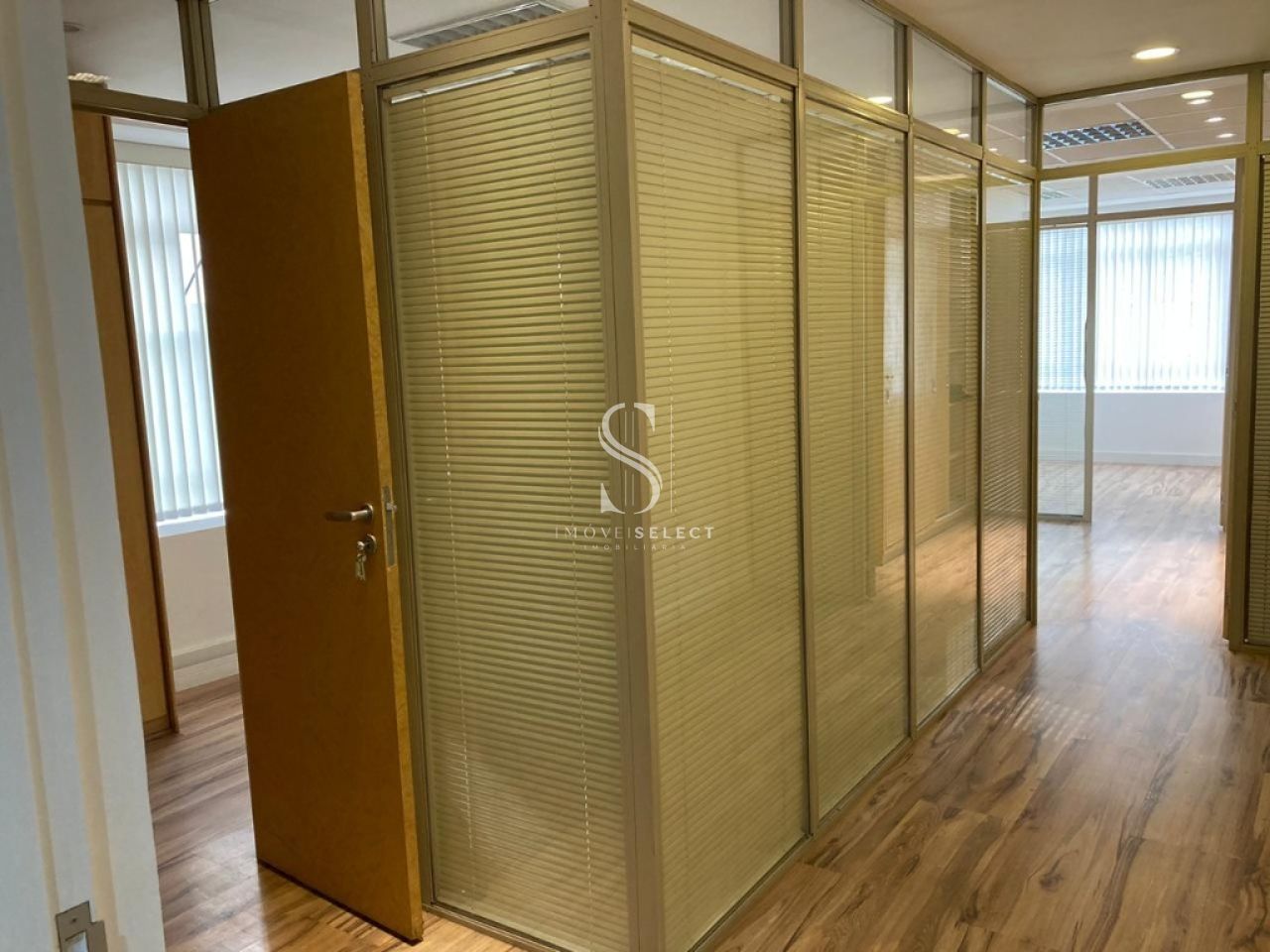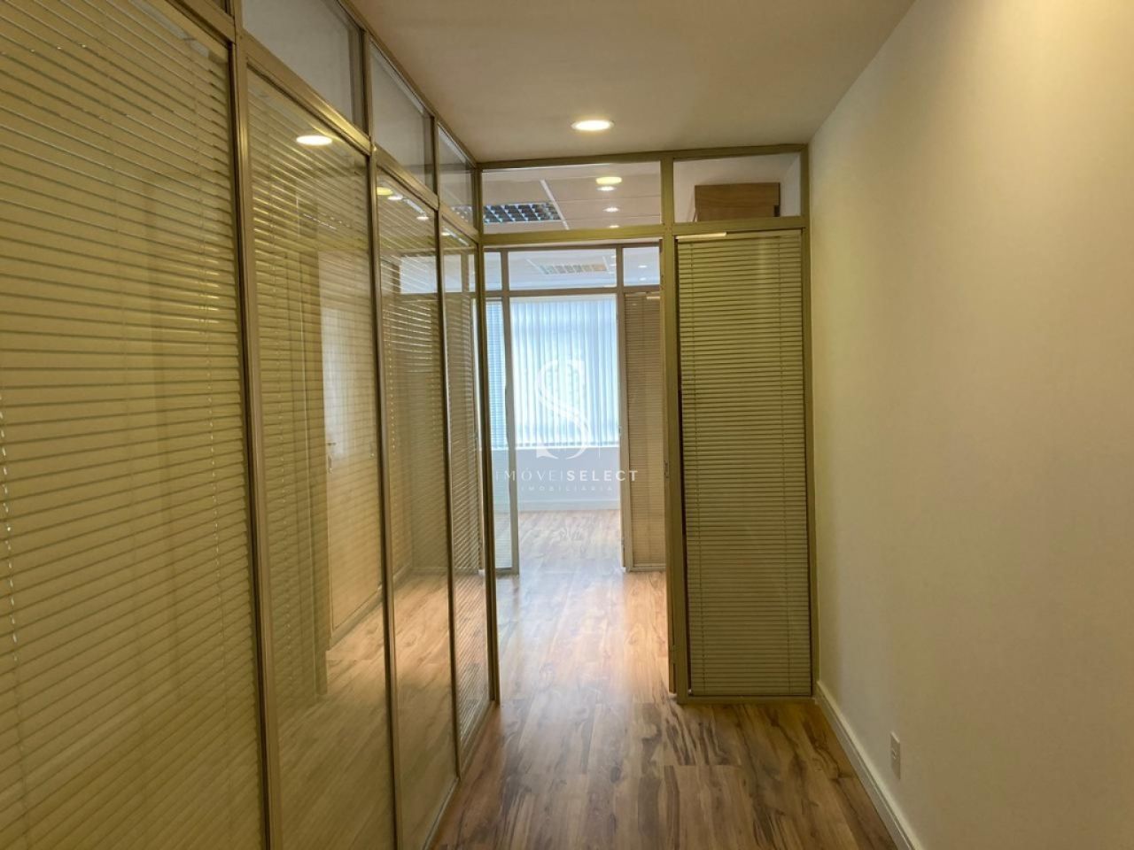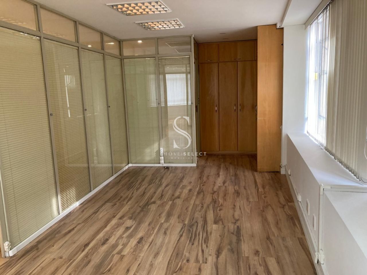 Conjunto Comercial de 55m² com 2 salas com cortinas verticais, 1 wc, copa, divisórias de vidro e persianas, piso laminado, armários. com Parque copa, ar condicionado, 1 vaga coberta.