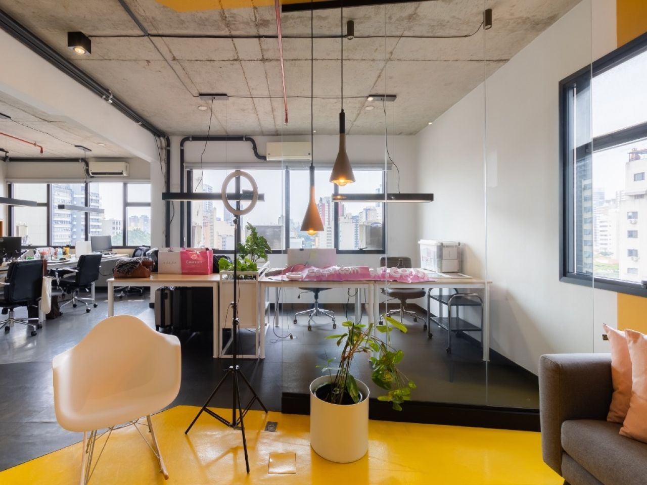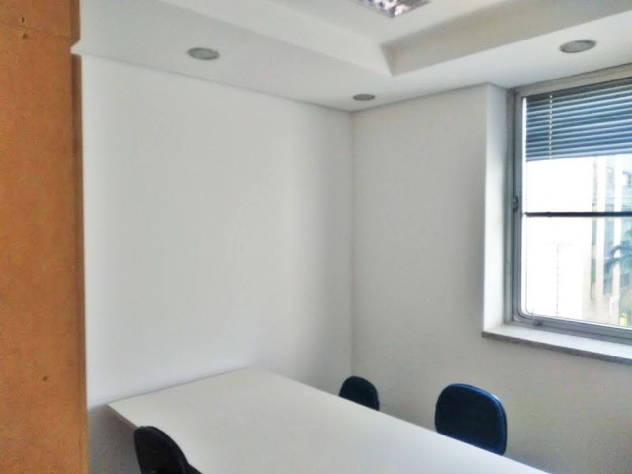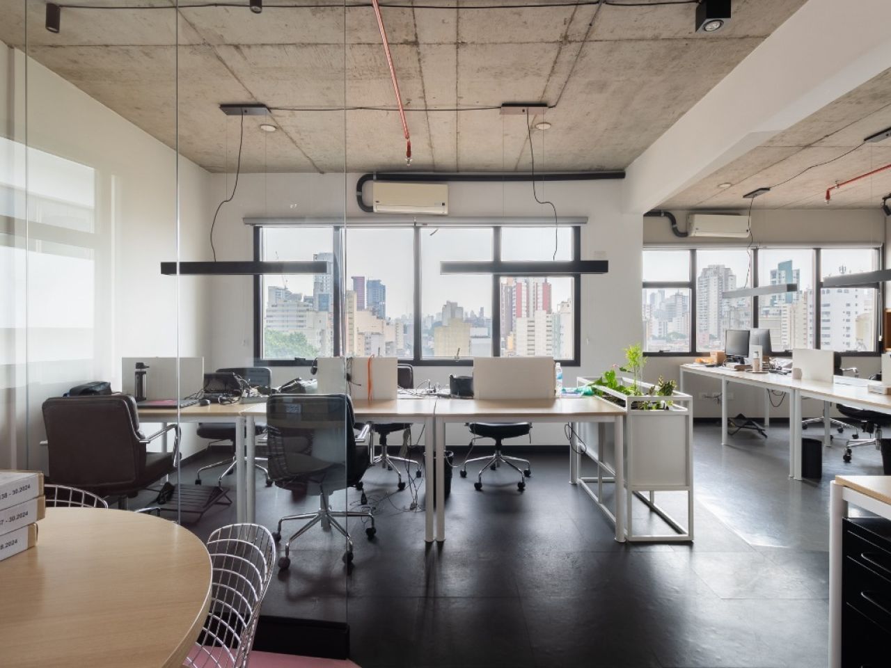 copa, 2 banheiros, sala de reuniões, recepção e área aberta para várias estações de trabalho.
