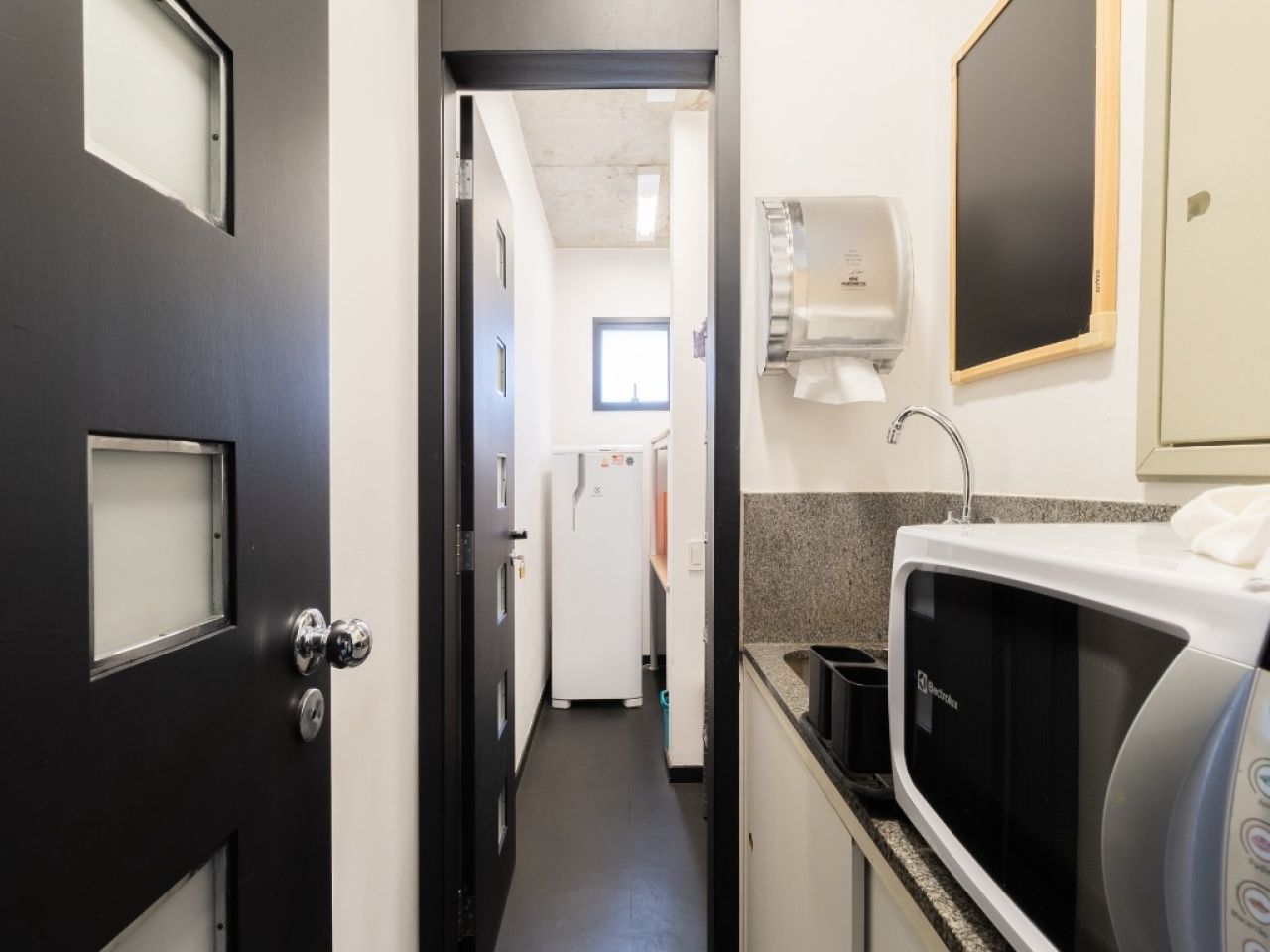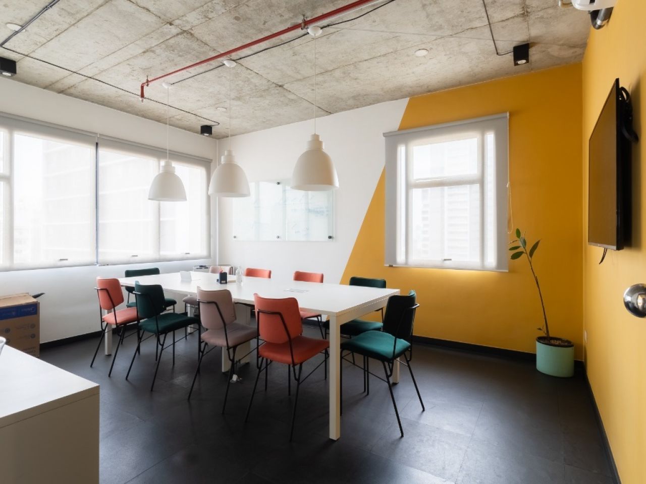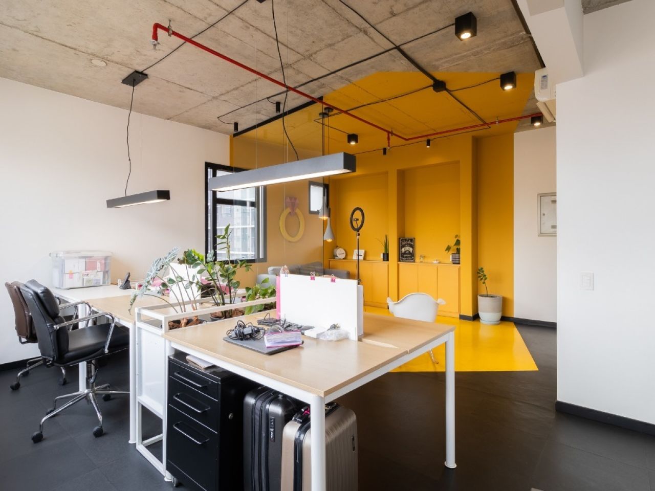 copa, 2 banheiros, sala de reuniões, recepção e área aberta para várias estações de trabalho.